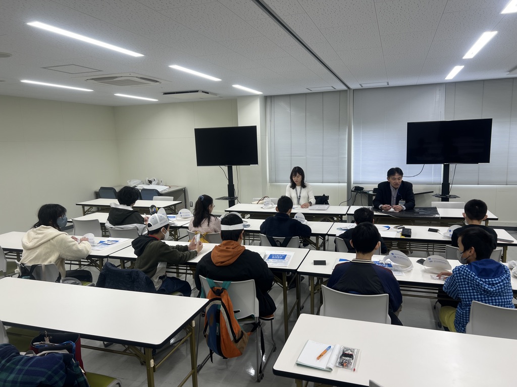 私たちジュニア記者は、横浜市営地下鉄グリーンラインの川和車両基地へ取材に行きました。中に入ると、電車が並んでいました。先に建物の中に入り、市役所の西堀さんと、交通局の星野さんにGREEN×EXPO 2027に向けてのお話を聞きました。GREEN×EXPO 2027のグッズももらいました。