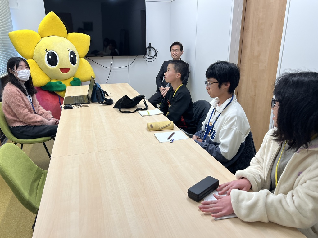 西区に行き、西区のマスコットキャラクター、にしまろちゃんについて取材しました。私たちが到着すると西区役所の会議室でにしまろちゃんがイスに座って待っていてくれました。